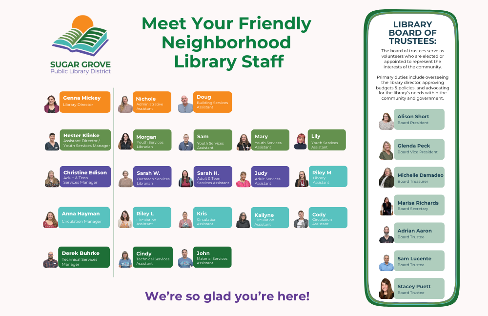 The Board of Trustees (7) are elected & serve unpaid 4 year terms. There are 8 FT employees. There are 12 part time employees. Sugar Grove Library District joined IMRF as of 7-1-2024. The Library has around an average of 10 volunteers per month. The Library Foundation works in partnership to support the Library.